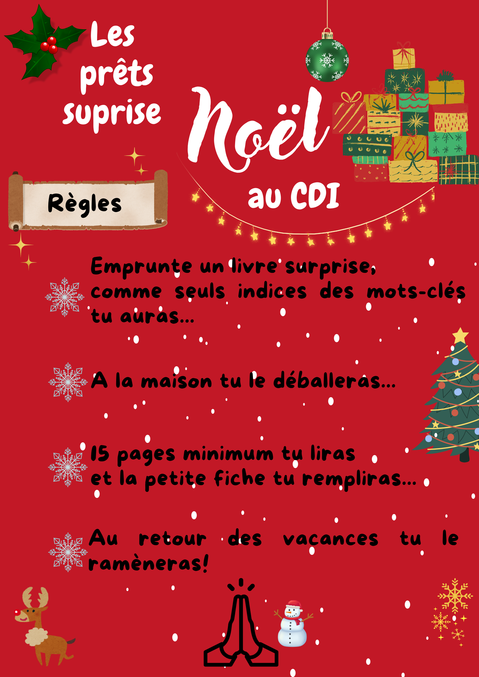 Viens donc au CDI à la récréation vendredi matin pour emprunter un prêt surpise de Noël...mais attention, il faudra suivre les règles du jeu pour en profiter!